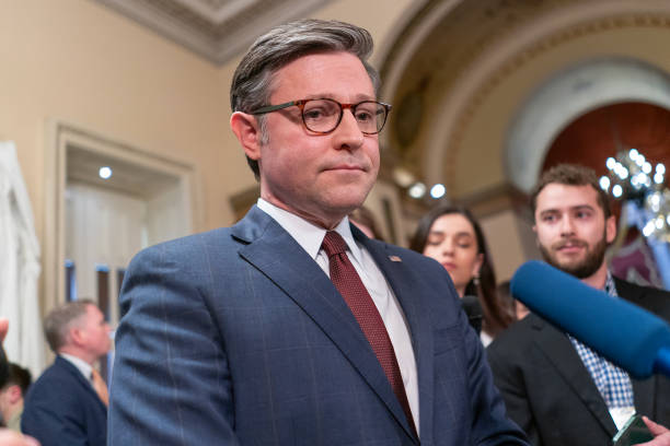 A montage begins, edited tightly, presenting fictional clips of Mike Johnson speaking across different appearances, each moment echoing the last with uncanny similarity.